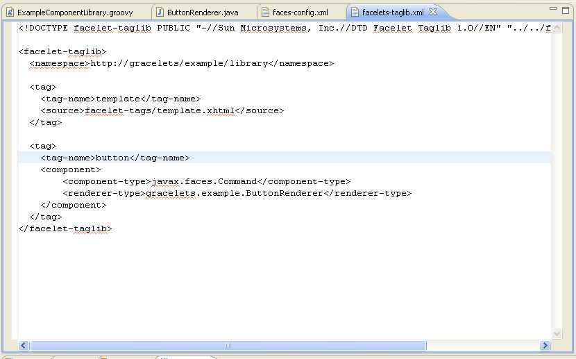 Above we define a facelet library in the WEB-INF/classes/META-INF directory in our web application. Below we