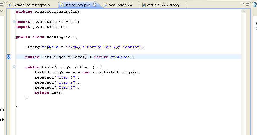 Below we see how you would define a backing bean/controller in basic JSF and then using Gracelets and then how you could use